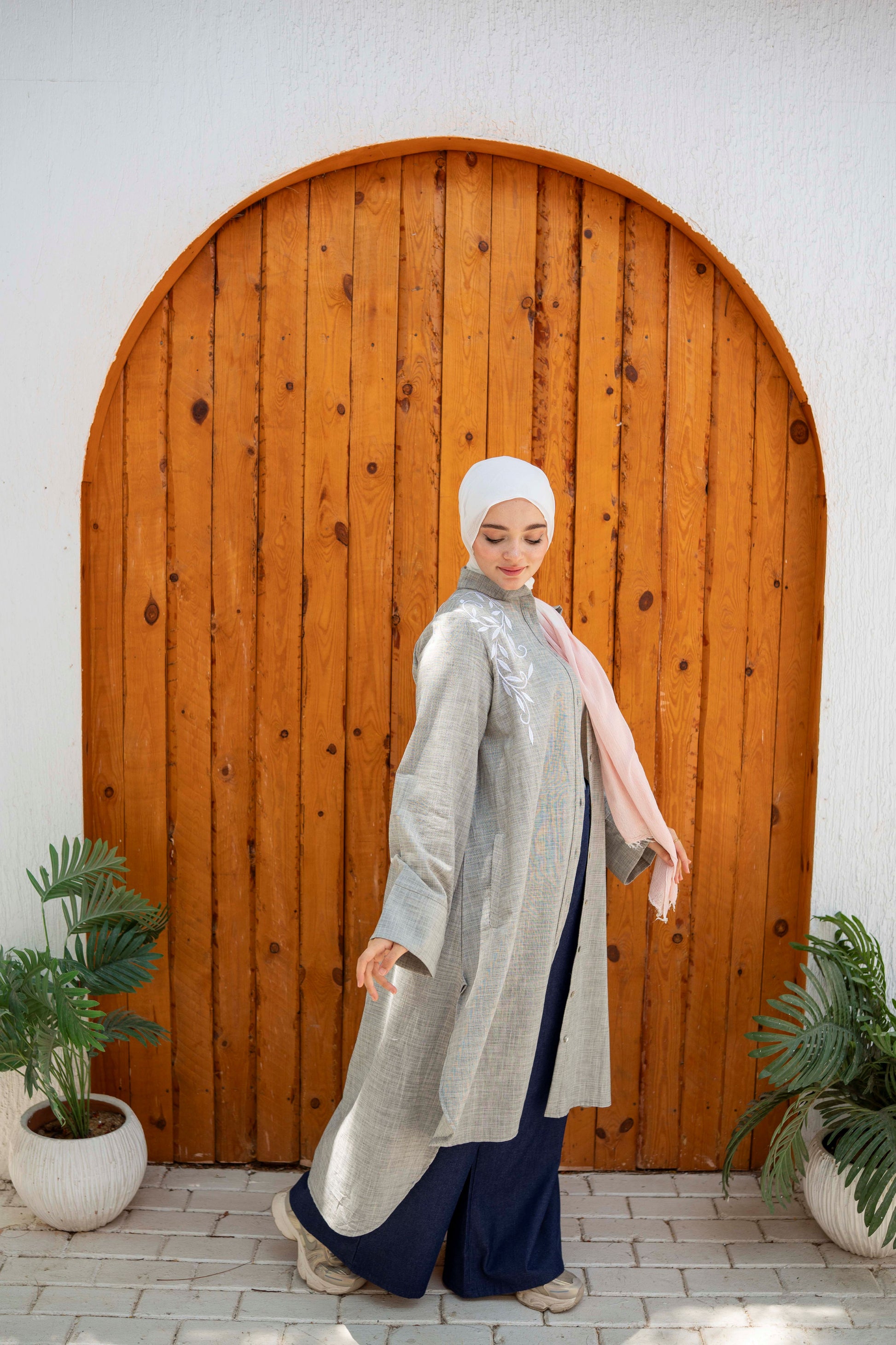 بلوزة طويلة بتطريز ناعم على أحد الجانبين (أمام وخلف)، بأزرار أمامية ونهاية واسعة للأكمام. تحتوي على فتحتين جانبيتين من الأسفل، وجيوب عملية، وحزام يمكن ارتداؤه أو الاستغناء عنه حسب تفضيلك.