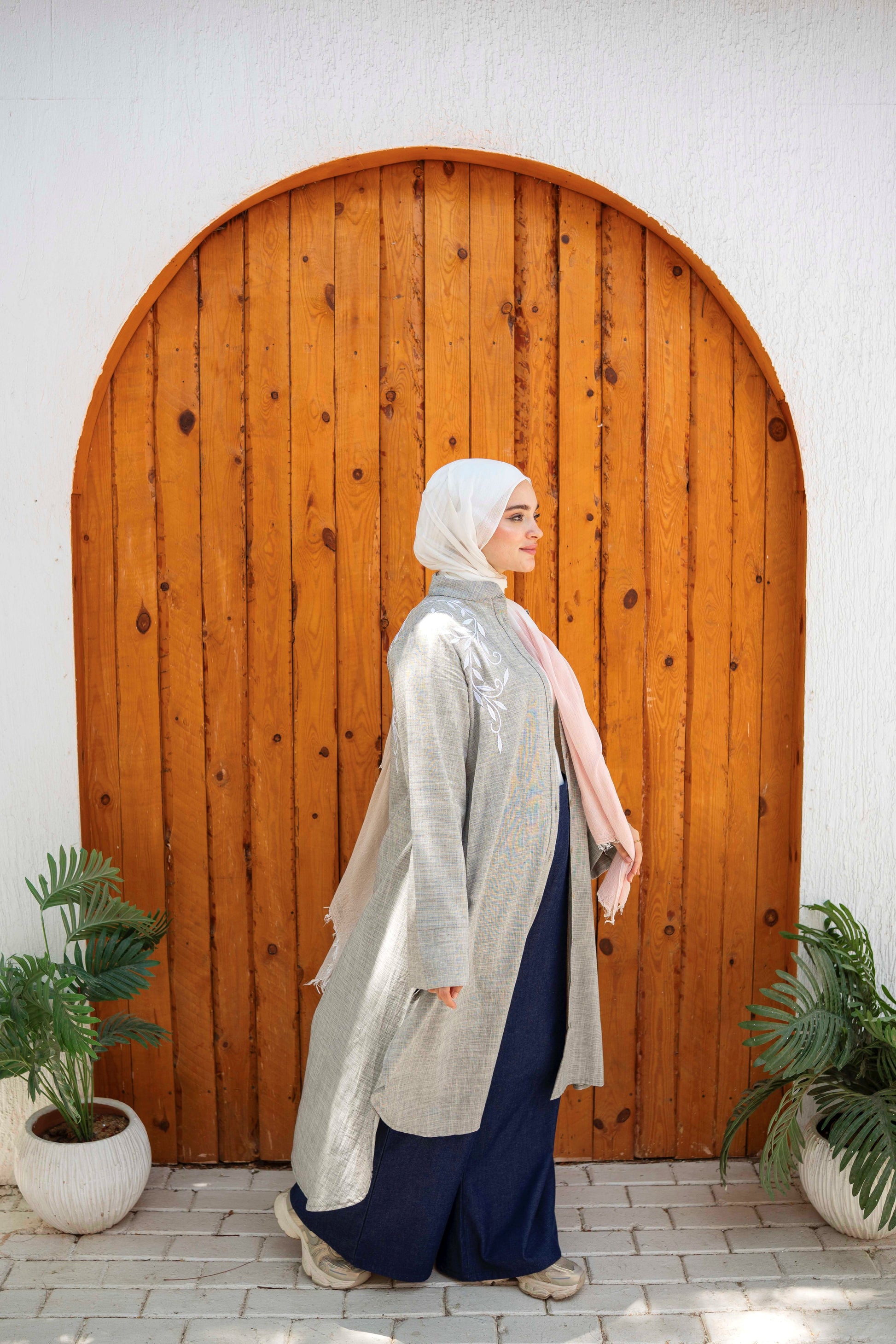 اللون: رمادي هادئ مع تطريز بخيوط بيضاء على أحد الجانبين (أمام وخلف)